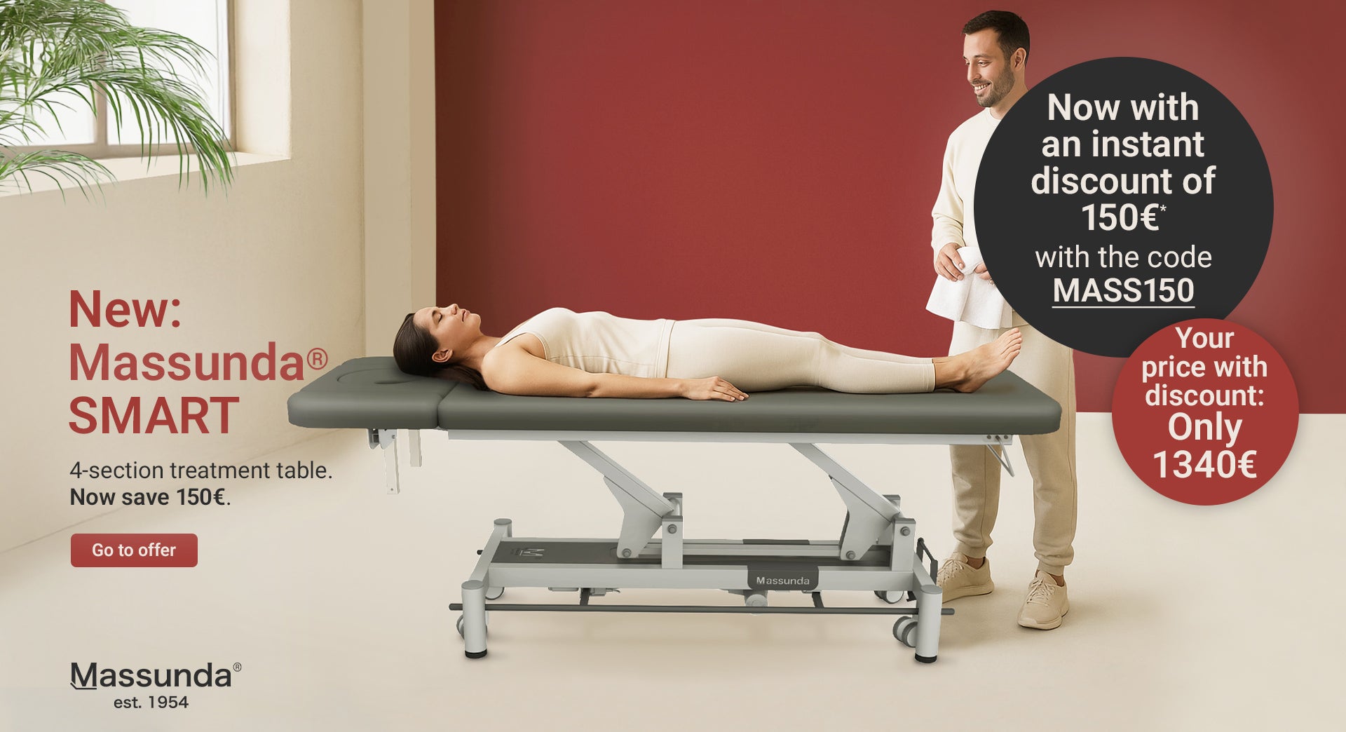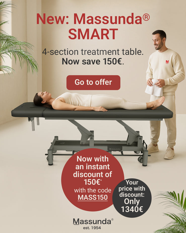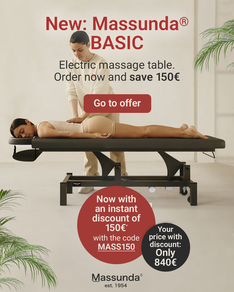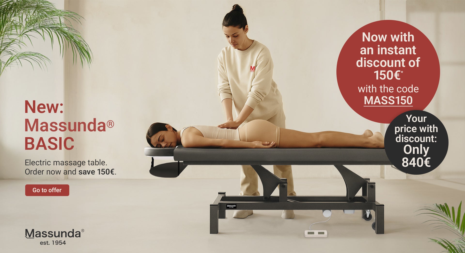 The promotion is valid until October 31, 2025. The €150 discount is only valid for the following models: Massunda® BASIC and Massunda® SMART. This discount cannot be combined with other vouchers or discounts. The Halloween promotion code "Halloween10" is valid until November 2, 2025, and is only applicable to portable massage tables of the Massunda® and ZEN MASSAGE WARE® brands.