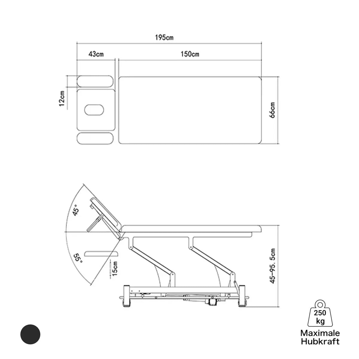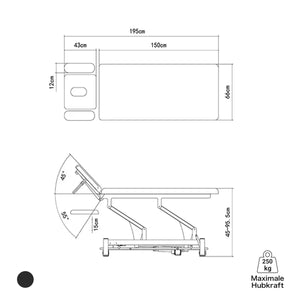 The Coinfycare PARIS therapy couch impresses with its technical features and sophisticated functions. With a length of 195 cm and a width of 66 cm, it offers ample space for comfortable treatment. Its adjustable height from 47.5 to 91.5 cm ensures you can perfectly adapt the treatment couch to your individual treatment needs. The height adjustment is controlled via a 360-degree switch , which can be operated from all four sides of the couch.