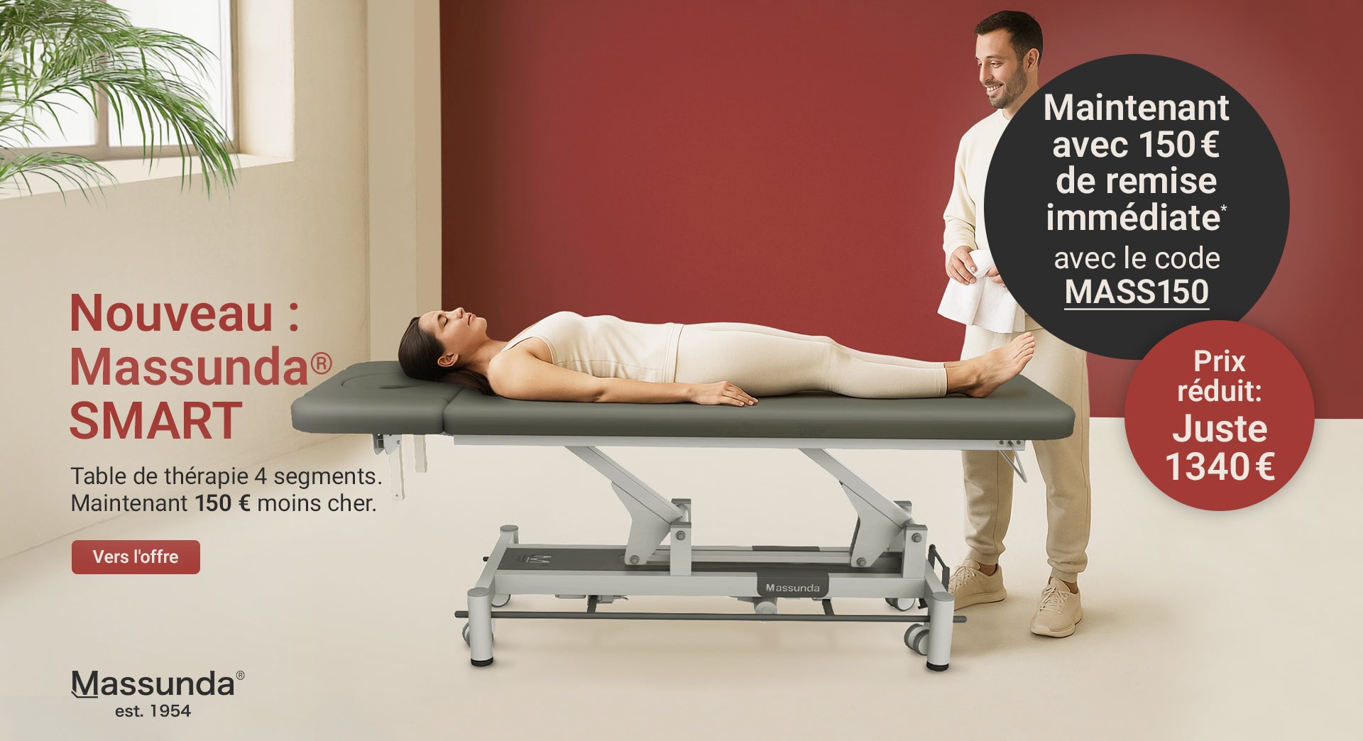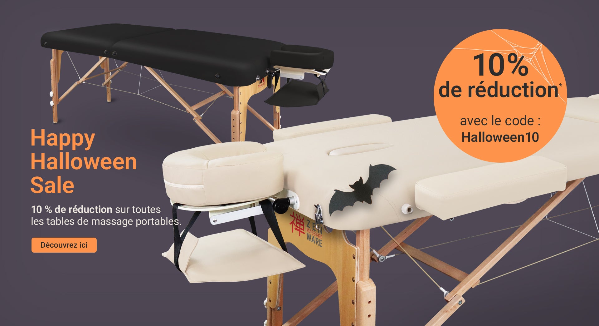 Cette promotion est valable jusqu'au 31 octobre 2025. La réduction de 150 € est valable uniquement sur les modèles suivants : Massunda® BASIC et Massunda® SMART. Cette réduction n'est pas cumulable avec d'autres bons de réduction. Le code promotionnel Halloween « Halloween10 » est valable jusqu'au 2 novembre 2025 et s'applique uniquement aux tables de massage portables des marques Massunda® et ZEN MASSAGE WARE®.