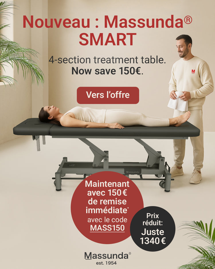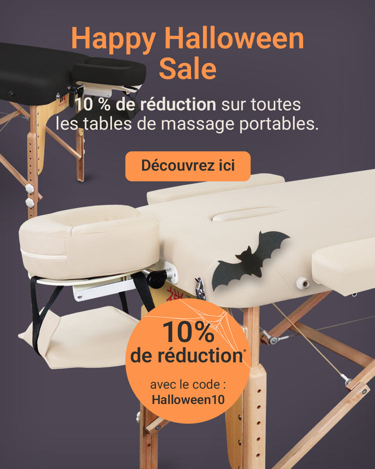 Cette promotion est valable jusqu'au 31 octobre 2025. La réduction de 150 € est valable uniquement sur les modèles suivants : Massunda® BASIC et Massunda® SMART. Cette réduction n'est pas cumulable avec d'autres bons de réduction. Le code promotionnel Halloween « Halloween10 » est valable jusqu'au 2 novembre 2025 et s'applique uniquement aux tables de massage portables des marques Massunda® et ZEN MASSAGE WARE®.